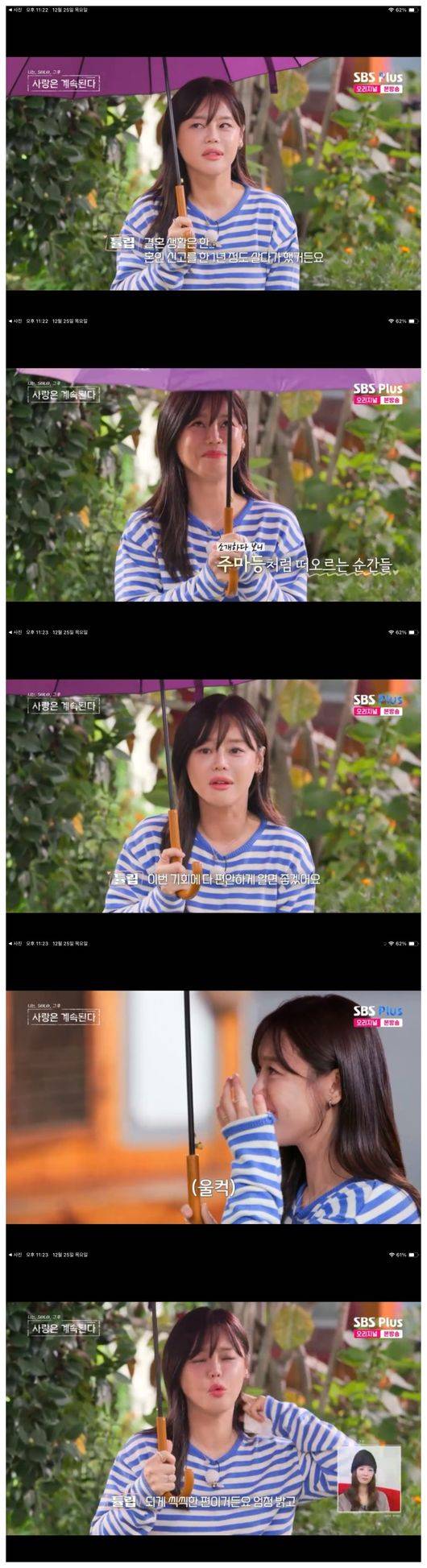 이어 자기 소개가 이뤄졌다. 튤립은 “저는 85년생이고, 부산에서 왔고, 돌싱이며 자녀가 한 명 있다. 제가 양육하고 있다”라면서 “아이가 다섯 살인데, 발달이 좀 늦었다. 네발 걷기도 늦고, 말도 늦었다. 발달 지연 판정을 받았다. 심각한 건 아닌데 치료를 하면서 보자고 했다. 언어 치료 다니고 있고, 어린이집 갔다가 센터를 간다. 괜찮을 것 같다고 하더라”라고 말하다가 눈물을 쏟았다.