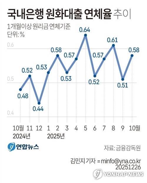 (서울=연합뉴스) 김민지 기자 = 26일 금융감독원에 따르면 지난 10월 말 국내은행의 원화대출 연체율(1개월 이상 원리금 연체 기준)은 0.58%로 전월 말보다 0.07%포인트(p) 올랐다.