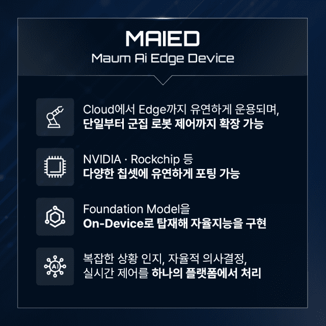 마음AI는 이번 'CES 2026'에서 ‘MAIED(MaumAI Edge Device)’를 ‘온디바이스 로봇 두뇌(On-device Robot Brain)’로 정의하고, 해당 개념을 중심으로 한 피지커AI 기술을 선보인다. 'MAIED'는 2025년기준 '퀄컴 QCS6490' IoT 칩셋에 세계 최초로 STT-LLM-TTS를 통합 적용해 검증한 기술을 토대로, 자체 설계한 엣지 디바이스에 인지·판단·행동을 하나의 실행 흐름으로 내재화한 물리적 의사결정 지능이다. 이는 AI 모델을 기기에 올린 수준이 아니라, 로봇이 외부 의존 없이 현장에서 스스로 보고, 말하고, 판단하며 행동할 수 있도록 설계된 두뇌 체계라는 점에서 기존 자동화 시스템과 구별된다고 회사는 덧붙였다.