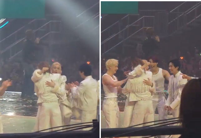 이내 다른 멤버들 역시 함께 무대 바닥을 살피며 무언가를 찾기 시작했고, 잠시 뒤 필릭스가 무대 틈새에서 귀걸이를 발견해 들어 올리자 현진은 그를 끌어안으며 안도의 미소를 지었다.