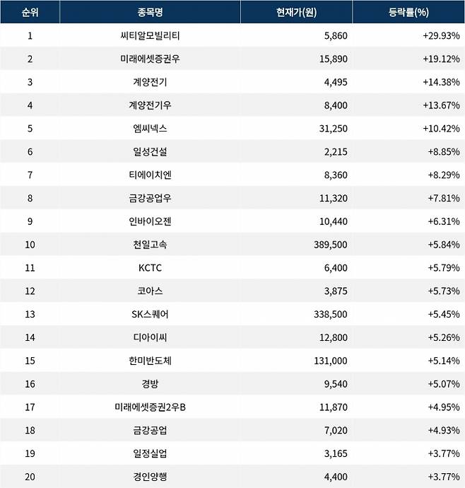 이밖에도 KCTC(009070) ▲5.79%, 코아스(071950) ▲5.73%, SK스퀘어(402340) ▲5.45%, 디아이씨(092200) ▲5.26%, 한미반도체(042700) ▲5.14%, 경방(000050) ▲5.07%, 미래에셋증권2우B(00680K) ▲4.95%, 금강공업(014280) ▲4.93%, 일정실업(008500) ▲3.77%, 경인양행(012610) ▲3.77% 등을 기록하며 시장에서 활발히 거래되고 있다.