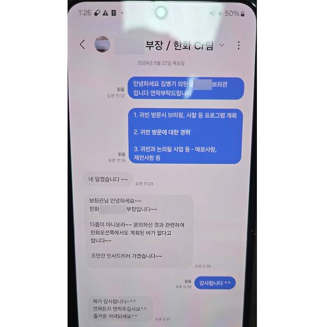 당시 보좌진 A씨는 실제로 김 의원 아들이 보내온 내용들을 한화 측에 전달해 사실 관계를 파악했습니다.