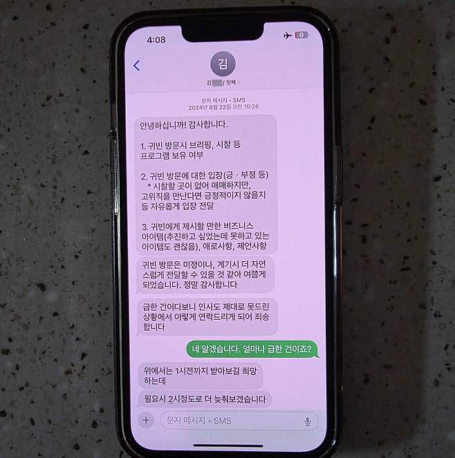 2024년 8월 22일 오전 10시 26분 김 의원 아들이 보낸 메시지에는 "1. 귀빈 방문시 브리핑, 시찰 등 프로그램 보유 여부? 2. 귀빈 방문에 대한 입장 3. 귀빈에게 제시할 만한 비즈니스 아이템" 등 마치 업무 보고서 양식을 따온 듯한 질문이 적혀 있었습니다.