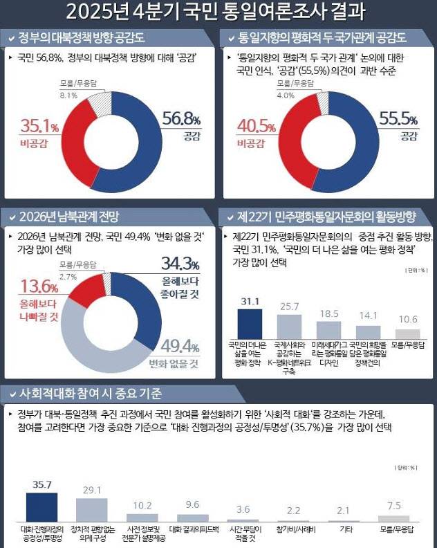 민주평화통일자문회의(민주평통)가 실시한 2025년 4분기 국민 통일여론조사에서 응답자의 과반이 정부의 대북정책 방향과 '통일 지향의 평화적 두 국가 관계' 논의에 공감하는 것으로 나타났다.