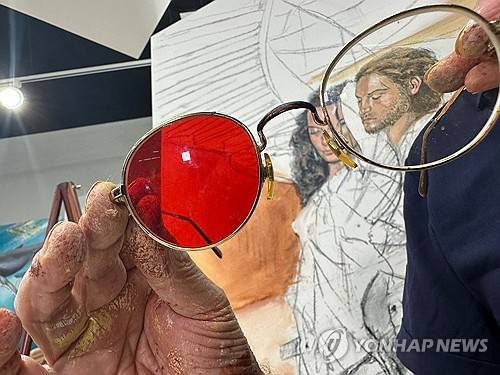 Fernando Dávila, a colorblind painter, shows his glasses designed to help see color at his gallery in Doral, Fla. on Thursday, Dec. 18, 2025. (AP Photo/Cody Jackson)