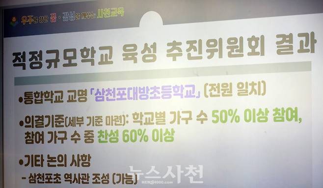 | ▲ 적정규모학교 육성 추진위원회 개최 결과, 통합학교 교명을 '삼천포대방초등학교'로 하기로 했다. 통폐합 결정에 따라, 통합 학교는 대방초로 하고, 삼천포초는 2027년 3월 폐지한다. |