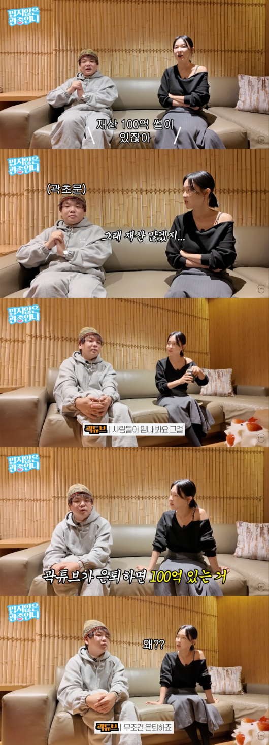 이에 PD는 "재산 100억설이 있다"고 했고, 곽튜브는 "100억이요? 돈 아예 없는데, 100억설을 사람들이 믿나봐요"라고 말했다.