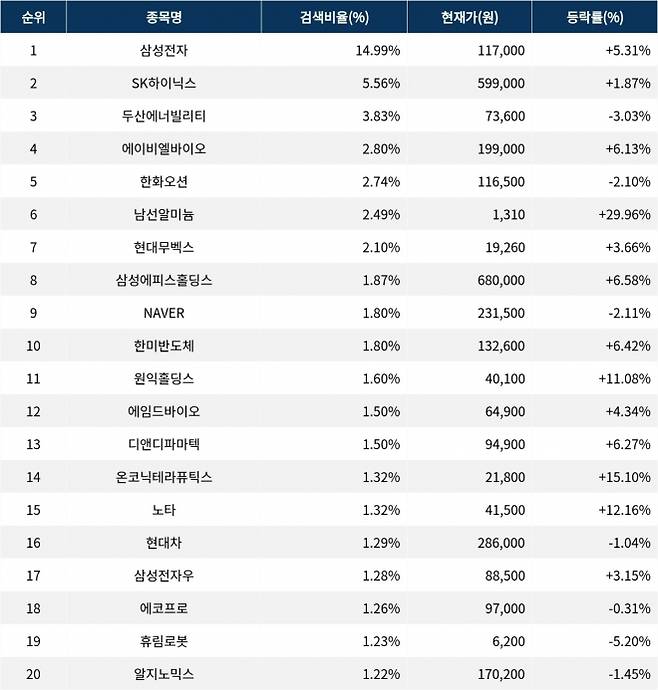 이어 검색비율 2위의 SK하이닉스(000660)는 상승률 1.87%로 상승 마감했다. 검색비율 3위의 두산에너빌리티(034020)는 3.03% 하락 마감했다. 검색비율 4위 에이비엘바이오(298380)는 상승률 6.13%를 기록했다. 검색비율 5위 한화오션(042660)은 2.10% 하락했다.