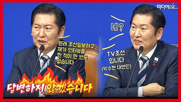 하지만 정청래 대표는 아예 “답변하지 않겠다”며 “원래 조선일보하고 제가 인터뷰를 한 적이 한 번도 없다”고 답변을 거부했다. 박수현 대변인이 “TV조선입니다”라고 했지만, 정청래 대표는 “네”라고만 하고 “오늘 다 끝났습니까? 딱 한 분만 더”라며 다시 마지막 질문 기회를 다른 기자에게 돌렸다. 그러자 전자신문 기자가 가장 먼저 손을 들어 지명 받았다.