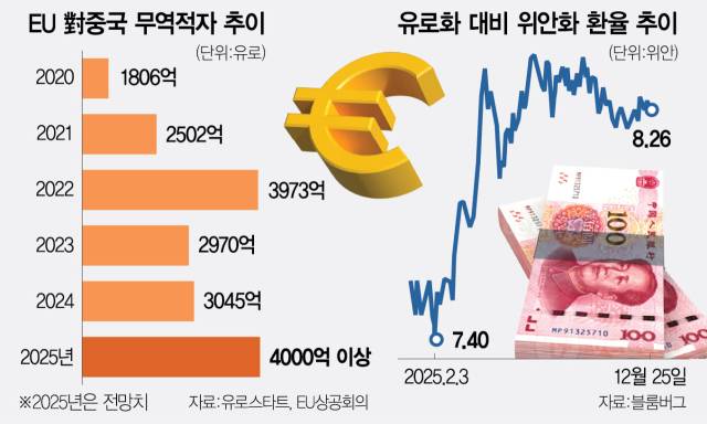 중국 위안화가 약(弱)달러의 영향으로 강세를 나타내고 있는 반면 유로화 대비로는 약세를 이어가면서 유럽연합(EU)이 대응책 마련에 골몰하고 있다. 중국의 물량 공세로 인해 올해 사상 최대 수준의 대(對)중국 무역적자가 예상되는 상황에서 유로 대비 위안화 약세는 중국의 ‘저가 공습’을 심화시킬 수 있어서다. 일각에서는 품목별 관세든, 전면 관세든 더욱 강력한 조치를 취해야 한다는 강경론까지 나오지만 이 역시 실행으로 옮기기가 쉽지 않다는 반론도 적지 않다.