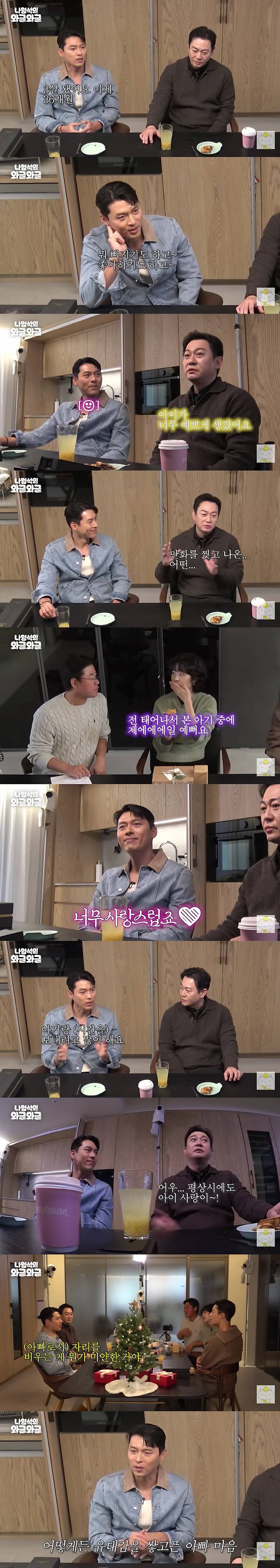 나영석이 "잘생기고 이런 걸 떠나서 너무 귀여울 때지 않냐"고 하자, 현빈은 "너무 사랑스럽다. 지금도 일이 없으면 온전히 아기와 시간을 보내려고 한다"며 아빠 미소를 지었다.