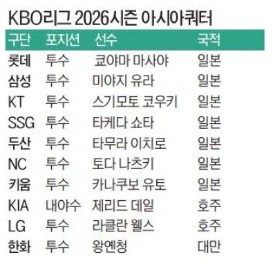 KBO리그 10개 구단의 아시아쿼터 국가별 비중은 일본 7명, 호주 2명, 대만 1명으로 나타났다. 제도가 처음 도입될 당시에는 호주 출신 선수들이 주목받을 것이라는 전망이 많았지만, 실제로는 내야수 제리드 데일(25·KIA 타이거즈)과 투수 라클란 웰스(28·LG 트윈스) 단 두 선수만 계약에 성공했다.