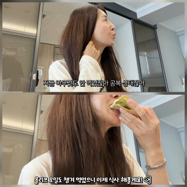 이날 그는 또띠아와 바질 페스토, 모짜렐라 치즈, 방울토마토로 간단한 식사를 준비하며 공복에 올리브 오일을 곁들였다. 남편, 딸과 함께하는 평범한 식사였지만, 그 안에는 꾸준히 쌓아온 생활 루틴이 녹아 있었다.