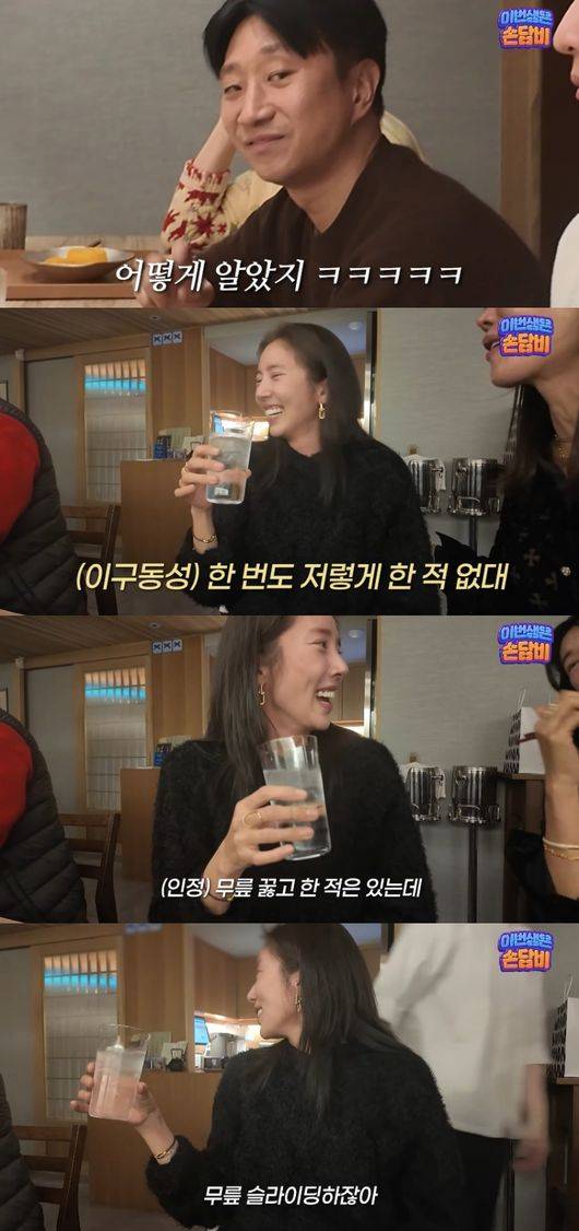 가만히 듣던 손담비는 “한 번도 저렇게 한 적 없다. 무릎 꿇고 한 적은 있다”며 “자기 술 많이 마시면 바로 나한테 무릎 슬라이딩 하잖아”라고 폭로했다.
