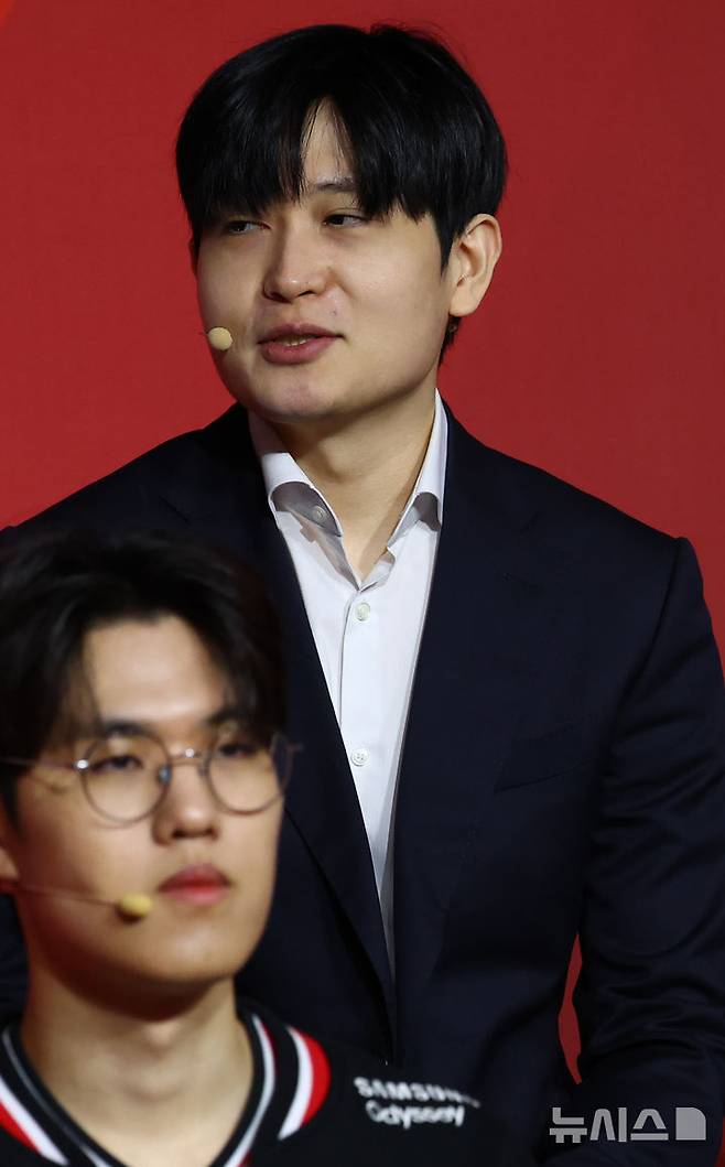 [서울=뉴시스] 박주성 기자 = Tom 임재현 코치가 26일 오후 서울 잠실DN콜로세움에서 열린 T1 LoL 2026 시즌 출정식에 참석해 내년 시즌에 대한 각오를 말하고 있다. 2025.12.26. park7691@newsis.com