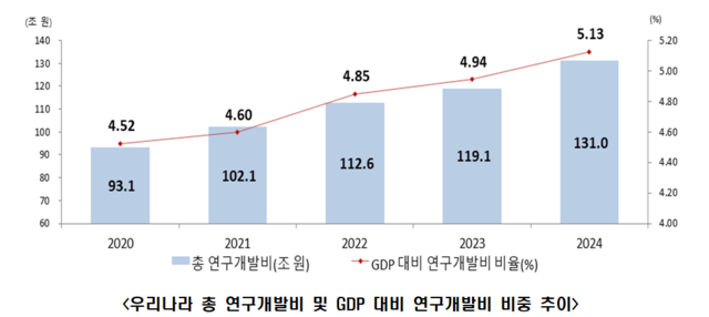 지난해 R&D 투자 131조원…GDP 대비 5% 첫 돌파, 이스라엘 이어 세계 2위