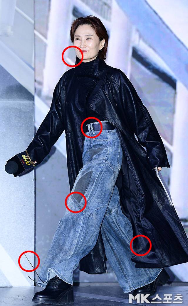 롱코트를 휘날리며 무대에 오르고 있는 박경림의 사진에서 다른 부분 5군데를 찾아보세요.