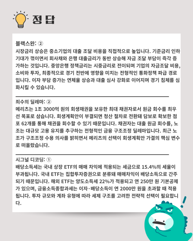 ■ 중기 대출 연체율 1% 육박 주의: 10월 말 기준 중소기업 대출 연체율이 0.93%까지 치솟으며 5월 이후 최고치를 기록했다. 내수 부진과 금리 상승 이중고로 건설·지방 부동산 중심 부실 확대 가능성에 관련 종목 리스크 점검이 필요하다.