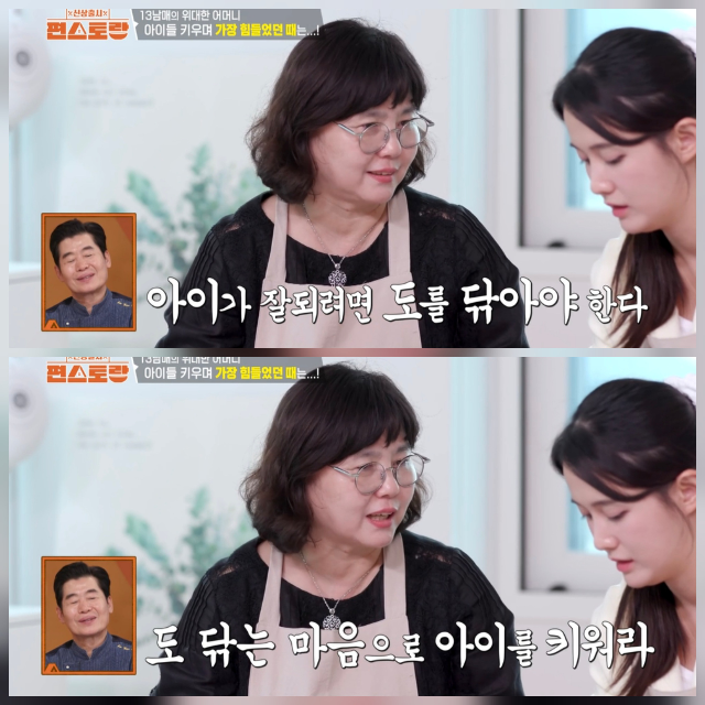 어머니는 "아이 키울 때는 도 닦는 마음으로 하라고들 하지 않느냐"며 자신의 육아를 돌아봤고, 이를 들은 남보라는 "진짜 도를 닦았다. 엄마 몸에서 사리가 나왔다"고 말하며 안타까움을 감추지 못했다.