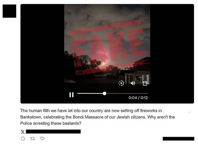 이 뿐 아닙니다. SNS 상에서는 호주의 뱅크스타운 지역에서 폭죽을 터트리는 영상이 퍼졌습니다. 역시 'FAKE'가 적힌 워터마크를 넣었습니다.