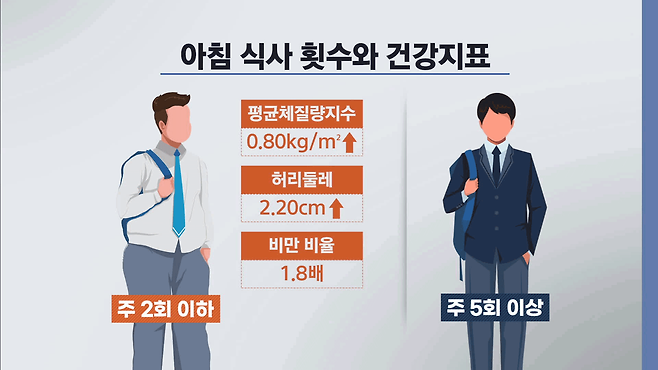 연구 결과 주당 아침 식사 횟수가 2회 이하인 학생들은 5회 이상인 학생들보다 평균 체질량지수가 0.80kg/㎡ 높았고, 허리둘레는 2.20cm 더 길었습니다. 비만 비율은 주 2회 이하 식사 집단이 14.22%, 주 5회 이상 식사 집단이 7.80%로, 주 2회 이하 식사 집단이 1.8배였습니다.