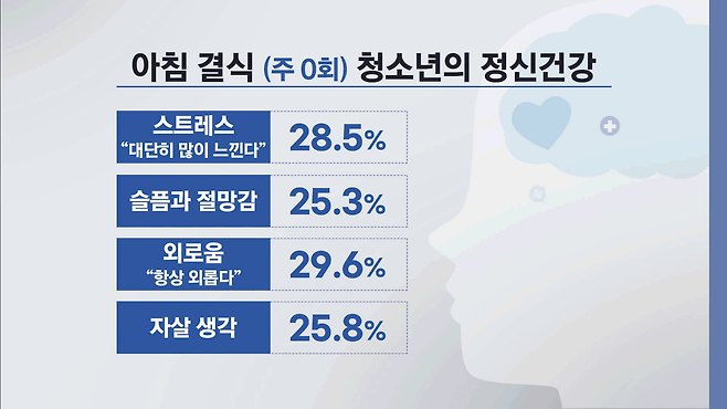 아침 식사의 영향은 여기서 그치지 않고 정신 건강과도 밀접하게 연관됩니다. 남형경 극동대 호텔외식조리학과 교수는 2021년~2023년 청소년건강행태조사에 참여한 중고등학생 약 16만 명을 대상으로 아침 결식에 따른 학습과 건강 행태를 분석하면서 정신건강에 미치는 영향도 연구했습니다.