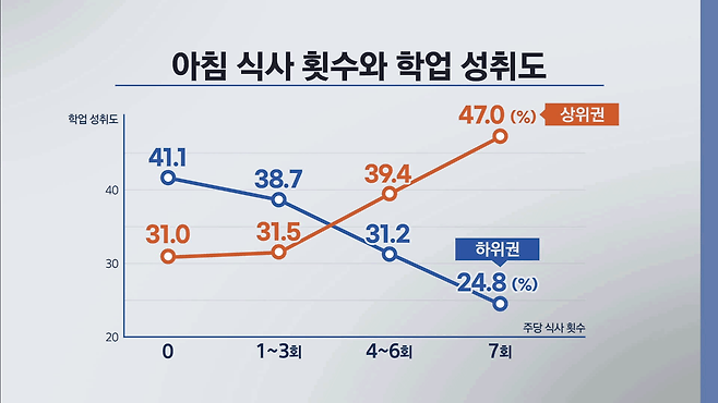 분석 결과 한 주에 매일 아침 식사를 한 집단에서 학업 성취도가 상위권인 학생 비율이 47.0%로 가장 많았고, 하위권 학생 비율은 24.8%로 가장 낮았습니다. 반면 아침 식사를 한 번도 안 한 집단에서는 상위권 비율이 31.0%였고, 하위권 비율이 41.1%였습니다.