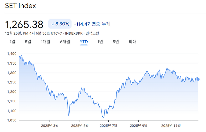 2위는 태국입니다. 태국 증시의 SET 지수는 올해 8% 넘게 하락했죠. 태국은 올해 내내 혼란기를 겪었습니다. 훈센 전 캄보디아 총리와의 통화내용이 유출되면서 패통탄 친나왓 총리가 잘렸고요. 캄보디아와의 국경 분쟁이 촉발한 무력 충돌이 갈수록 확산되면서 ‘준전시 상황’으로 치닫고 있죠.
