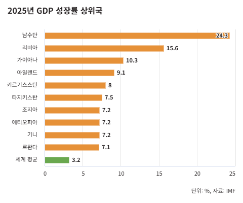 좀 다른 기준으로 살펴볼까요. 2025년 경제가 가장 빠르게 성장한 나라는 어디였을까요. IMF가 10월 발표한 전망치를 기준으로 순위를 매겼는데요. 1위는 성장률 24.3%의 아프리카 남수단, 2위는 15.6%의 리비아입니다. 두 나라 모두 지난해 줄었던 석유 생산량이 다시 회복된 결과이죠. 석유에 의존하는 두 나라는 이렇게 호황과 불황을 반복하는 특징이 있습니다.