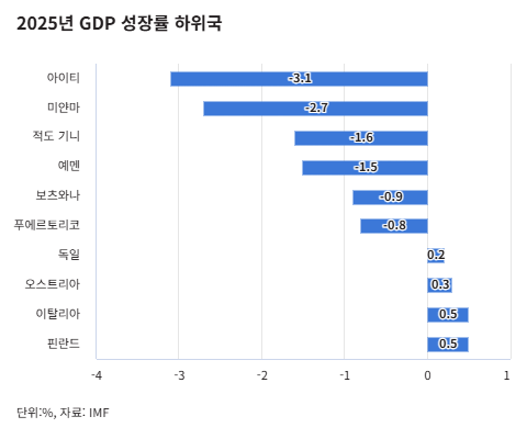 그럼 반대로 올해 경제 성장률 성적표가 가장 나쁜 나라는 어디일까요. 아이티(-3.1%), 미얀마(-2.7%). 이런 내전과 분쟁에 시달리는 최빈국들이 최하위권을 기록한 건 당연한데요.