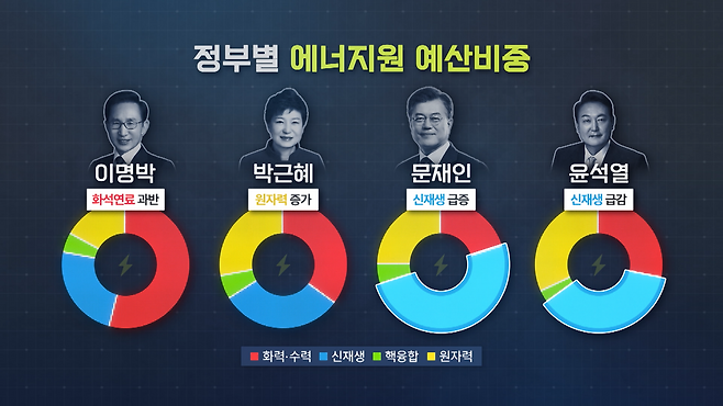 오락가락한 정부의 에너지 정책도 문제입니다. 우리 사회에는 언젠가부터 '진보 정부는 재생에너지, 보수 진영은 원자력'이라는 인식이 생겼습니다. 취재진은 이러한 인식이 실제 에너지 정책에도 영향을 미치고 있는지 규명해 보기로 했습니다. 나라살림연구소에 의뢰해 2010년부터 역대 정권별 에너지 예산을 분석했습니다.