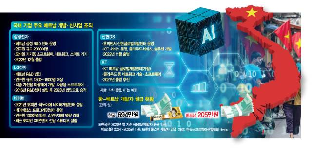 기업들이 베트남에 R&D 기반을 늘리는 이유는 준수한 개발 능력과 저렴한 임금이 맞물려서다. 인건비는 국내 채용의 절반 수준이다. 현지 개발자 채용 플랫폼인 아이티비엣(ITviec)에 따르면 베트남 6년 차 풀스택 개발자의 월급은 현재 3635만 동(205만 원)이다. 무엇보다 베트남의 고용 규제가 한국보다 덜하다는 점이 주효했다. IT 업계 관계자는 “국내 노동법이 더 세다는 것이 중요한 대목”이라며 “해외에서 채용하면 바쁜 시기에 집중 근무도 가능하다”고 말했다.