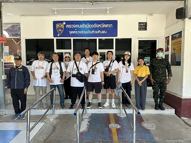 | ▲ 2025년 12월 16일 오후1시 53분. QJ3G+8G6, Mae Pa, Mae Sot District, Tak 63110 태국에서 마지막 검문직후 허가를 받고 촬영한 천 개의 희망팀 단체사진 (왼쪽부터 태국경찰, 권학봉, 장창근, 정면주, 성남훈, 함형열, 이윤후, 유예훈, 이보슬, 뉴 데이 스쿨 관계자, 태국경찰) |