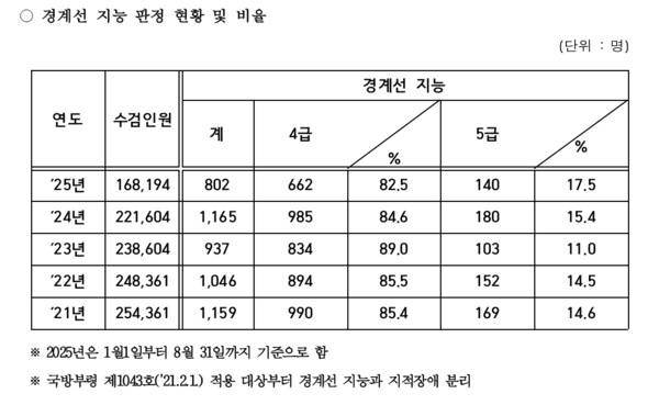 | ▲ 연도별 병역판정검사 인원 중 경계선지능인 판정 현황 |