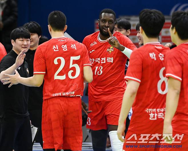 27일 수원실내체육관에서 열린 한국전력과 현대캐피탈의 경기, 1세트를 승리한 한국전력 베논이 기뻐하고 있다. 수원=허상욱 기자wook@sportschosun.com/2025.12.27/