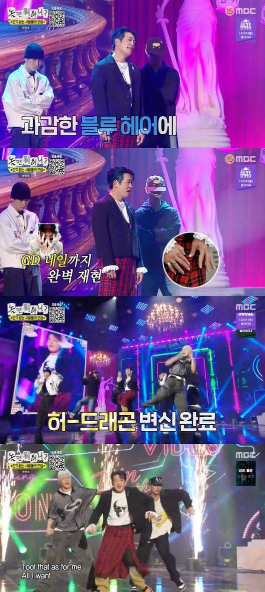 에픽하이의 투컷은 '트로트'와 '본 헤이터'를 불러 분위기를 달궜고, 마지막 무대는 본 방송 직전까지 인기순위 1위 허성태가 장식했다. 무려 유재석이 나서서 추천한 무대, 바로 지드래곤의 신곡 '투 배드(Too Bad)'였다. 과감한 블루 헤어에 체크무늬 치마, 손톱까지 꾸미며 '투 배드' 뮤직비디오 속 지드래곤을 구현한 그는 가수 현진영의 '흐린 기억 속의 그대'까지 무대로 선보이며 감탄을 자아냈다.