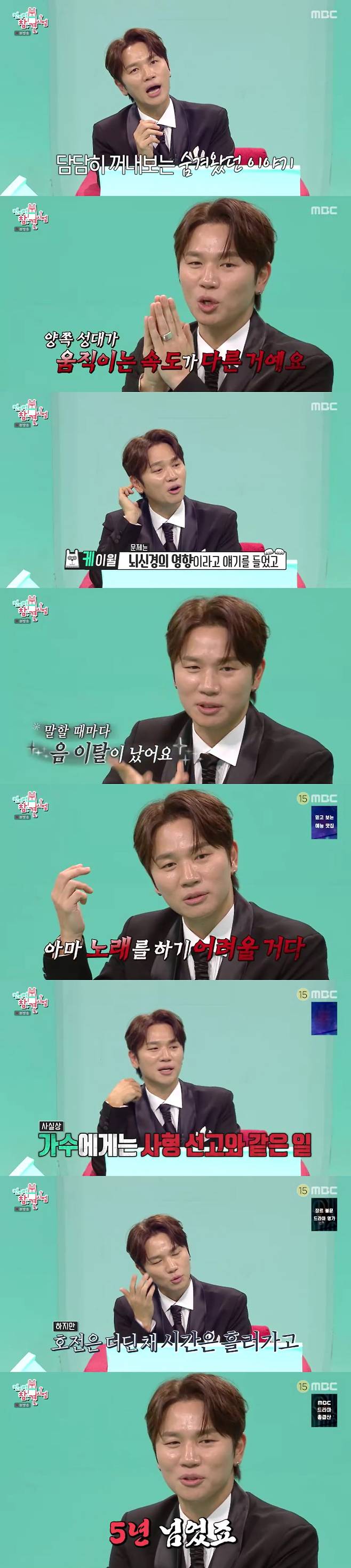 그는 이어 "병원에 가보니 성대가 원래 소리를 내기 위해 마찰을 일으키는데, 양쪽 성대의 움직이는 속도가 달랐다. 뇌신경 문제일 수도 있다는 이야기를 들었다"고 설명했다. 이어 "말할 때조차 음이탈이 나서 의사 선생님께서 '아마 노래하기 어려울 것 같다'고 하셨다"고 회상했다. 이를 듣던 송은이는 "가수로서는 사형 선고와 다름없는 말 아니냐"며 안타까워했다.