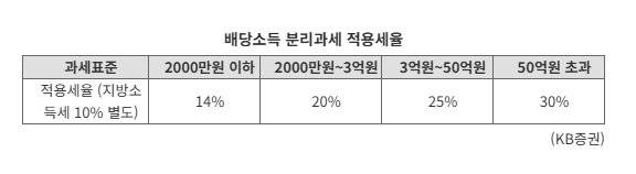 26일 KB증권에 따르면 앞으로 투자자들은 고배당기업으로부터 받은 배당금 중 2000만원 초과분부터 3억원까지는 20%, 3억원 초과 50억원 이하는 25%, 50억원 초과분은 30% 세율(지방소득세 별도)을 적용해 분리과세를 선택할 수 있다.