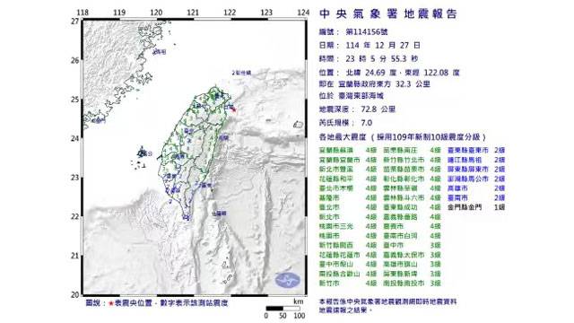현지시각 27일 오후 11시5분 타이완 이란현 동쪽 해역에서 규모 7.0의 지진이 발생했다고 타이완 교통부 중앙기상서(기상청)가 발표했습니다.