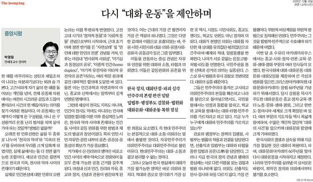 박명림 연세대 교수가 12월26일치 중앙일보에 ‘다시 대화 운동을 제안하며’라는 칼럼을 썼습니다.
