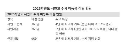2026학년도 서울대·연세대·고려대(서연고) 수시 미등록 이월 인원이 전년 대비 약 32% 증가하며 4년 새 최고치인 368명을 기록했다.