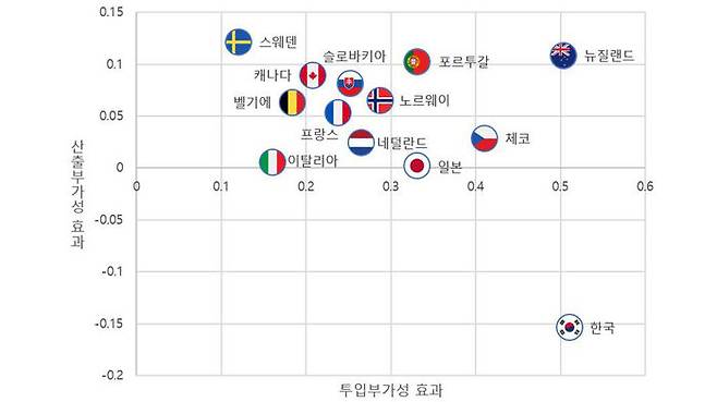 그 결과 한국의 경우 기업에 직접지원했을 때 투입 부가성이 주요국 중 가장 높은 수준으로 나타난 반면 산출 부가성은 가장 낮은 것으로 나타났습니다.