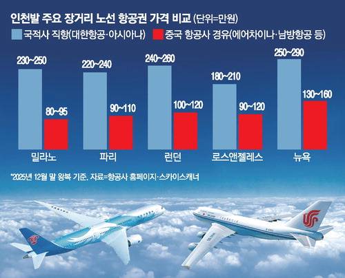 이들 항공사의 가격 경쟁력은 압도적이다. 인천~유럽·미주 왕복 항공권이 국적사 직항 기준으론 200만원대 이상인 반면 중국 경유편으로는 80만~100만원대 초반의 '반값표'가 쏟아진다.