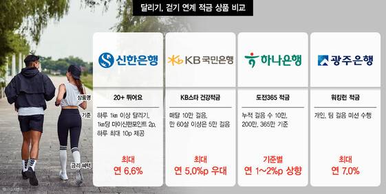 처음부터 달리기가 부담스럽다면 걷기 연계 상품에 관심을 가져볼 만하다. 케이비(KB)국민은행의 ‘케이비스타 건강적금’이 대표적이다. 지난 6월 출시한 이 상품은 자유적립식 적금으로 매달 10만 걸음(가입일 기준 만 60살 이상은 5만 걸음) 달성 시 우대금리가 적용된다. 가입자는 전용 앱에서 걸음 실적을 확인하고 해당 실적이 누적될 경우 최대 연 5.0%포인트까지 우대금리를 받을 수 있다. ‘즐거운 걷기’ 미션 달성, ‘발자국 스탬프’ 누적 인증, 제휴 건강관리 앱 회원 가입 등 다양한 조건을 충족하면 우대금리가 누적 적용된다