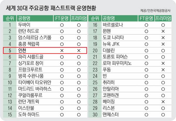 패스트트랙 제도는 별도 게이트를 통해 보안 검색과 출입국 심사를 진행하는 시스템이다. 인천공항에선 현재 교통약자나 우수 납세자, 다자녀 가구 등에 한해서만 패스트트랙 혜택을 제공하고 있는데, 이를 비즈니스·퍼스트클래스 승객이나 유료 신청 여객까지 확대해야 한다는 게 인천공항공사의 입장이다.