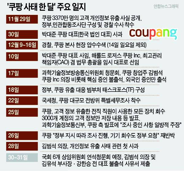 쿠팡에서 전례 없는 대규모 개인정보 유출 사고가 발생한 지 한 달이 됐지만 쿠팡이 단독으로 조사 결과를 발표하는 등 건건이 정부와 정면충돌한다. 국회는 30, 31일 쿠팡 사태 관련 연석 청문회를 개최하지만 이번에도 김범석 쿠팡아이엔씨(Inc) 의장은 28일 불출석을 통보해 국민적 공분을 살 것으로 보인다.