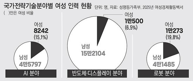과학기술 분야에 종사 중인 여성 인력이 5명 중 1명 수준에 머물러 있는 것으로 나타났다. 이재명 정부가 국가 전략 기술로 육성 중인 인공지능(AI)과 반도체 분야는 여성 인력 비율이 전년보다 오히려 줄어들며 성별 격차가 더욱 벌어졌다.