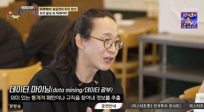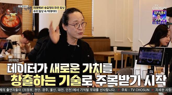 그런 가운데 빅데이터 전문가 송길영이 등장, "빅데이터는 AI에게 주는 밥"이라고 설명했다. '백반기행'을 봤냐는 질문엔 "잔잔하게 있는 그대로를 보여주시는 프로그램이다. 집에서 여러 찬으로 먹던 다복한 식사 전경이 쉽지 않으니, '백반기행'을 통해서 어릴 때 추억도 바라볼 수 있다"고 밝혔다.