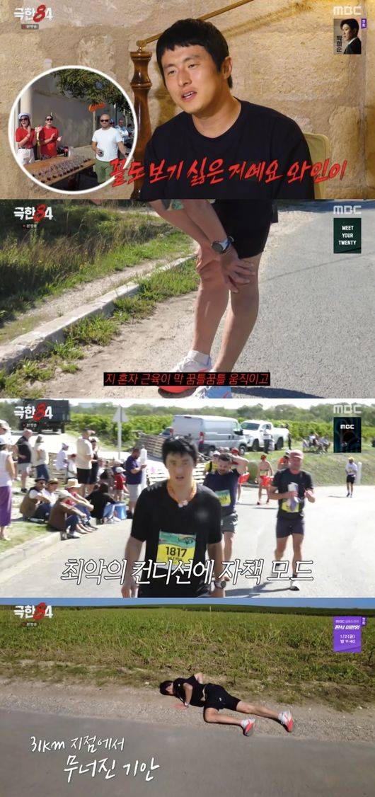 28일 방송된 MBC 예능 ‘극한84’에서는 프랑스 메독 마라톤에 출전한 기안84가 점점 악화되는 몸 상태에 결국 멈춰 선 모습이 그려졌다.
