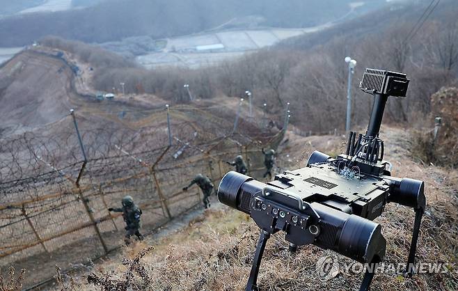 5사단 열쇠부대 군 장병들이 지난 22일 경기 연천군 접경지역에서 시범 운용 중인 다족 보행 로봇과 함께 철책 경계 근무를 하고 있다.